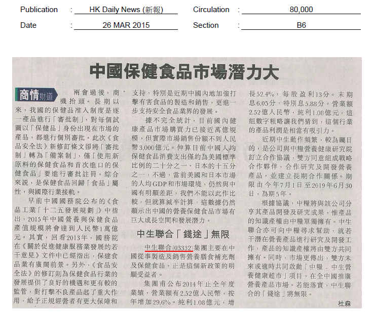 HK Daily News :Huge Potential of China Domestic Supplements Market